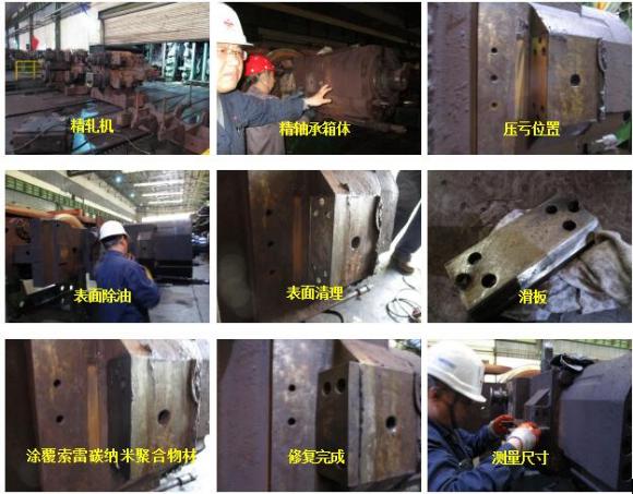 而目前索雷碳納米聚合物材料可以實現(xiàn)現(xiàn)場快速修復(fù),該材料具備優(yōu)越的粘著力,可以牢固附著在金屬基材表面,長期工作而不會脫落;產(chǎn)品自身具有極高的抗壓強度,在軋制力作用下,材料也不會損壞;獨特的材料良好的抗沖擊性能,可以吸收軸承座對牌坊的沖擊,避免了磨損的產(chǎn)生;同時產(chǎn)品具有良好的耐腐蝕性能,可使牌坊表面免受冷卻水的侵蝕。