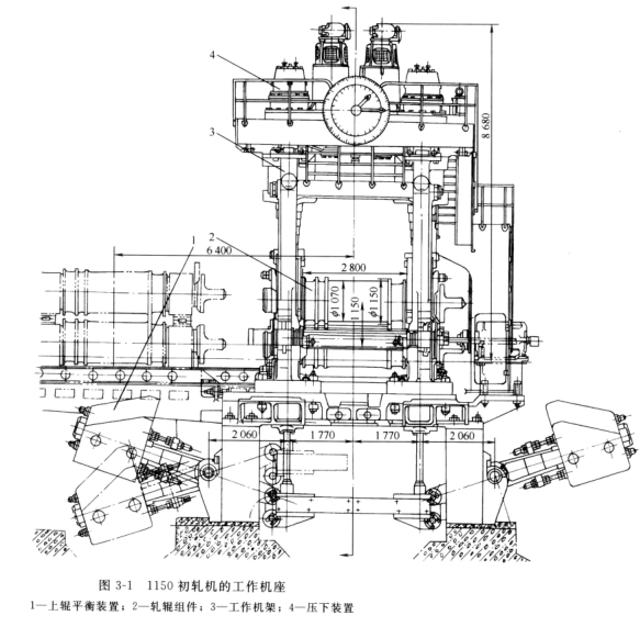 國產(chǎn)1150初軋機的主傳動形式為兩個低速直流電動機(功率4560kw,轉(zhuǎn)速0-70-120r/min)通過萬向連接軸分別傳遞兩個軋輥。上軋輥的主連軸器放在下軋輥主電機的上面。工作滾名義直徑為φ150mm,重車后較小直徑為φ1080mm,輥身長度為2800mm。1150初軋機的工作機座如圖3-1所示。他是由軋輥部件,機架部件,壓下平衡裝置等組成,但是每個部件都有其自己的特點,與板帶軋機和型鋼軋機不同。