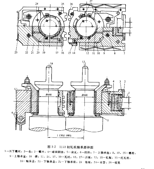 1150初軋機軋輥部件的結(jié)構(gòu)圖及立體示意圖如圖 3-2 及圖3-3所示。上軋輥放置在上軸承盒9及托瓦座 15 之間。瓦襯都是夾布膠木瓦,上軸承盒中有徑向瓦襯11 及肩瓦5,托瓦座中同樣也有徑向瓦襯14 及肩瓦。徑向瓦襯是用壓板 12定位。上軸承盒的腿插入托瓦座,并用螺栓 25緊固連接。初軋機與型鋼軋機不同點在于;在上軸承盒及機架間尚有一個上軸承座 7,上軸承座通過球面銅墊 4 與壓下螺絲1相接觸。軋制時,軋制壓力通過上軸承盒、上軸承座、球墊、壓下螺絲較終傳遞給機架上橫梁。在上軸承盒的上部有兩個突耳,突耳通過固定在上軸承座的螺栓 8使軋輥進行軸向調(diào)整。這種軸向調(diào)整的形式對于上軋輥移動量極大且次數(shù)頻繁的初軋機是較理想的,這也是軋輥部件中多設(shè)置一個上軸承座的原因所在。上軸承座法蘭內(nèi)側(cè)鑲有耐磨滑板 28。