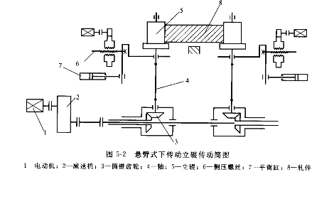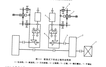 圖 5-3所示為框架式下傳動立輥傳動簡圖。它是由一臺電動機1,通過主傳動減速機 2、萬向接軸 3、立輥箱 4來傳動立輥5,為保證、右壓下螺絲的同步,減速機 2 之間用一根軸連接起來。為便于維護檢修,電動機放在軋機組的主傳動側。立輥機座的主傳動裝置安裝在地基上,側壓螺絲6和立輥箱 4安裝在水平機座的機架上。