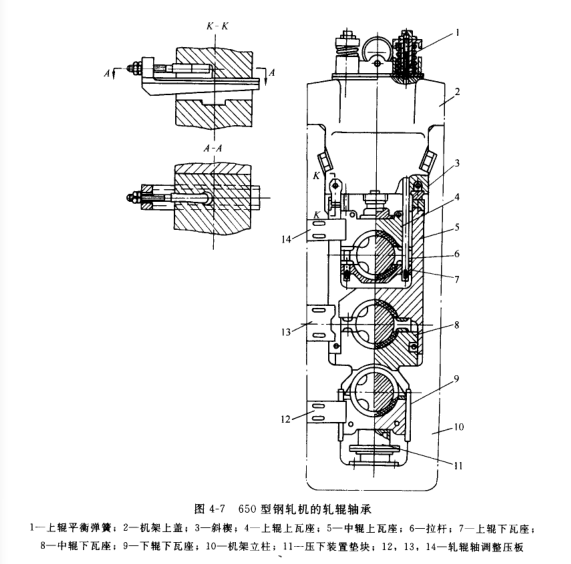 650型鋼軋機的軋輥軸承如圖4-7所示,五塊整體壓制徑向和軸向膠木瓦分為別裝在相應(yīng)的五個瓦座中,除中輥上瓦座5的材料為ZG40Cr外,其余瓦座為ZG35,上輥上瓦座4通過墊塊與壓下螺絲端部接觸,下壓座7通過拉桿6(每邊一根)掛在平衡彈簧上。為便于換輥,中輥上瓦座5是“H”形瓦座(簡稱H架),他向下的兩條腿通過嵌于機架上蓋燕尾槽中的斜楔3支撐在機架上,當中輥襯瓦磨損時,可通過斜楔3進行調(diào)整,使“H”形瓦架始終壓在中輥輥頸上中輥的下瓦座8直接支靠在機架立柱的凸肩上,下輥只有下瓦座9,它通過墊塊11直接支在壓下螺絲上。