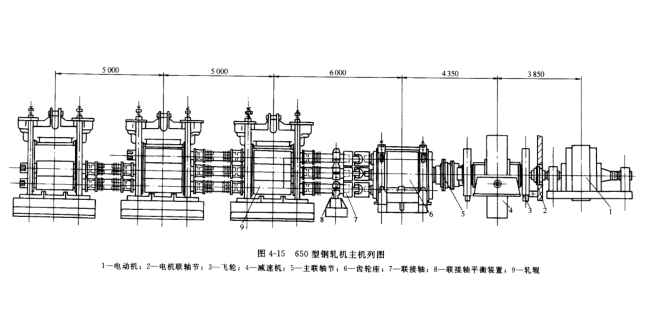 圖4-15所示為650型鋼軋機主機列圖,電動機1的運動和力矩通過電動機連軸節(jié)2,減速機4,朱連軸節(jié)5,齒輪座6和連接軸7傳遞給軋輥9,在此傳動中設置了飛輪3及聯(lián)軸節(jié)平衡裝置8.